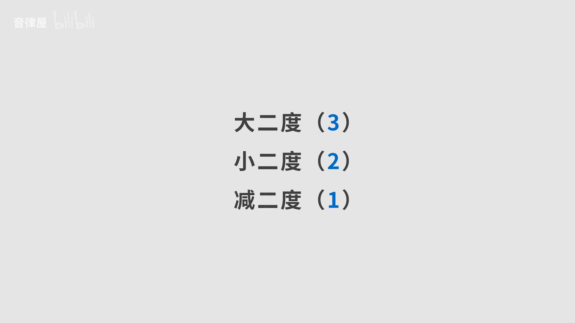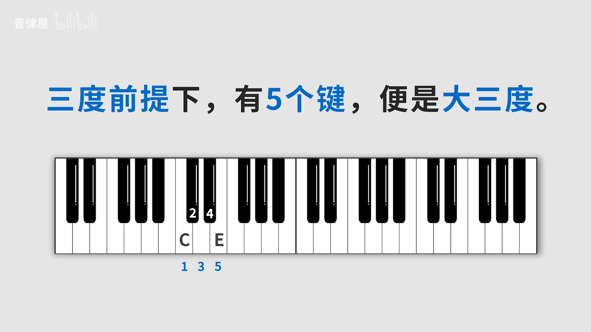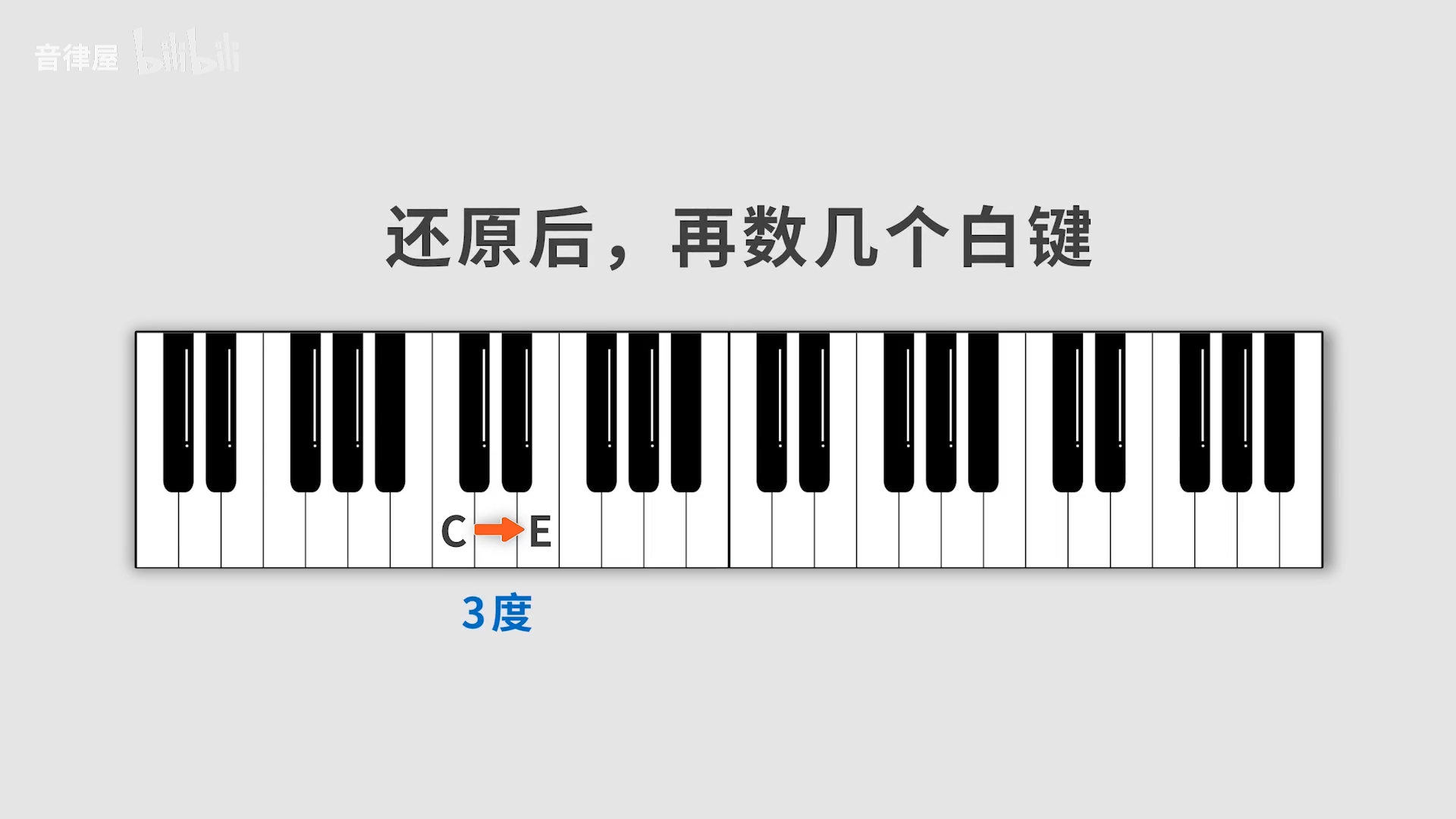 eg:比如 A-C,数一下有四个键,但是大三度C-E有5个键,少一个,所以称为小三度