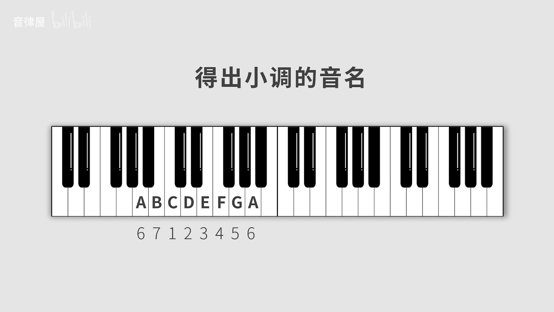 先找到A,然后往后推一个全音和一个半音(往前两个图中写着的关系),就找到了对应大调,然后把1对应大调的音名标好后,往前推就可以得出结论啦。