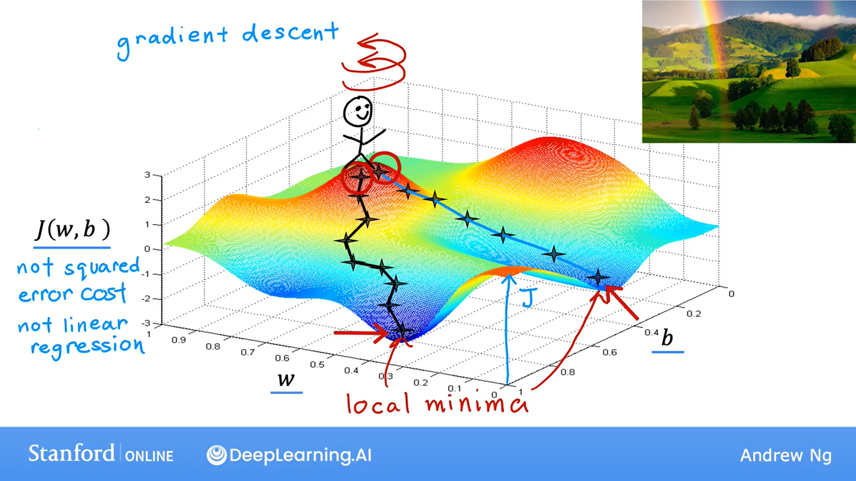 梯度下降背后的思想是:开始时我们随机选择一个参数的组合,计算代价函数,然后我们寻找下一个能让代价函数值下降最多的参数组合。我们持续这么做直到找到一个局部最小值(local minimum),因为我们并没有尝试完所有的参数组合,所以不能确定我们得到的局部最小值是否便是全局最小值(global minimum),选择不同的初始参数组合,可能会找到不同的局部最小值。