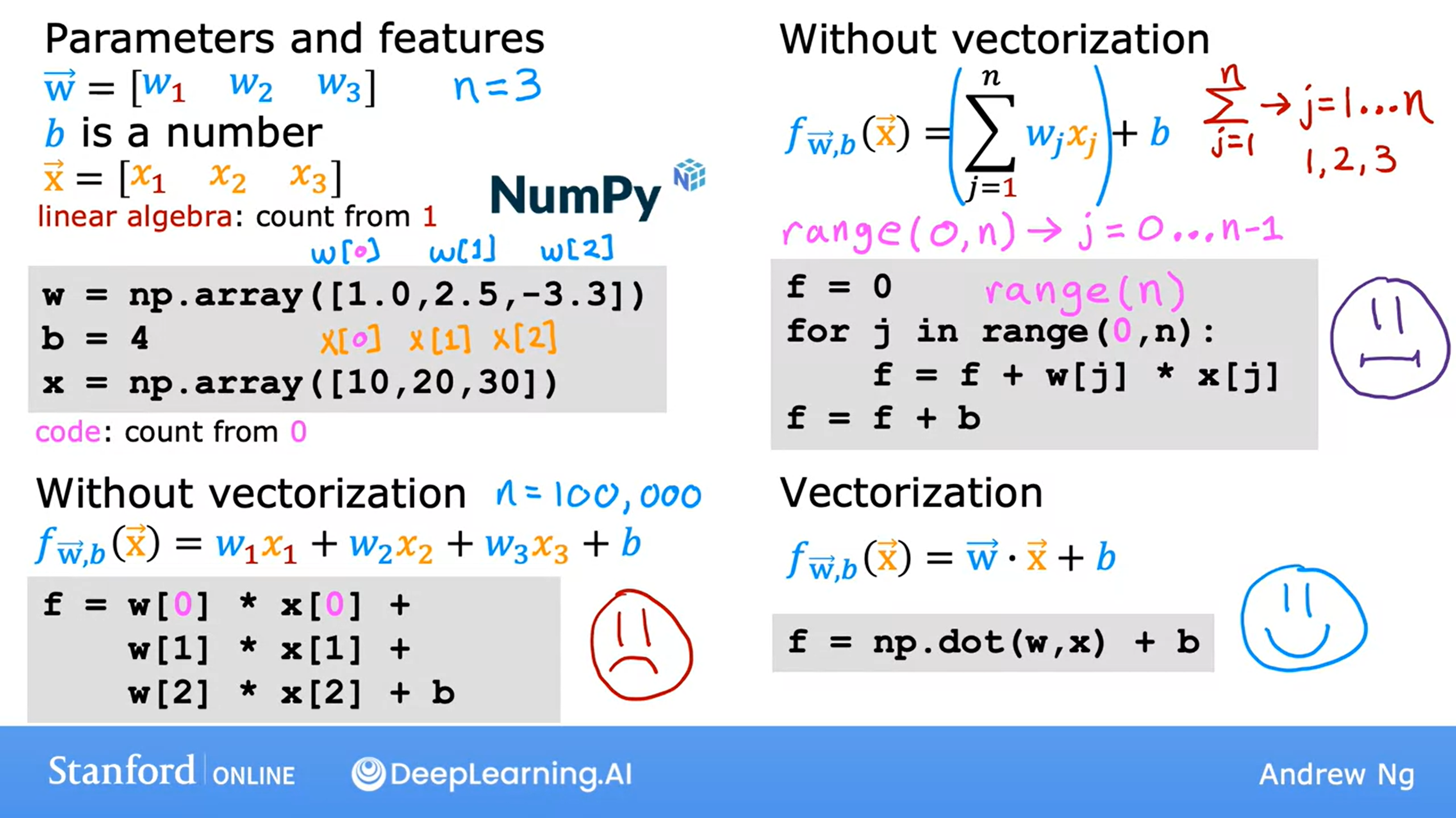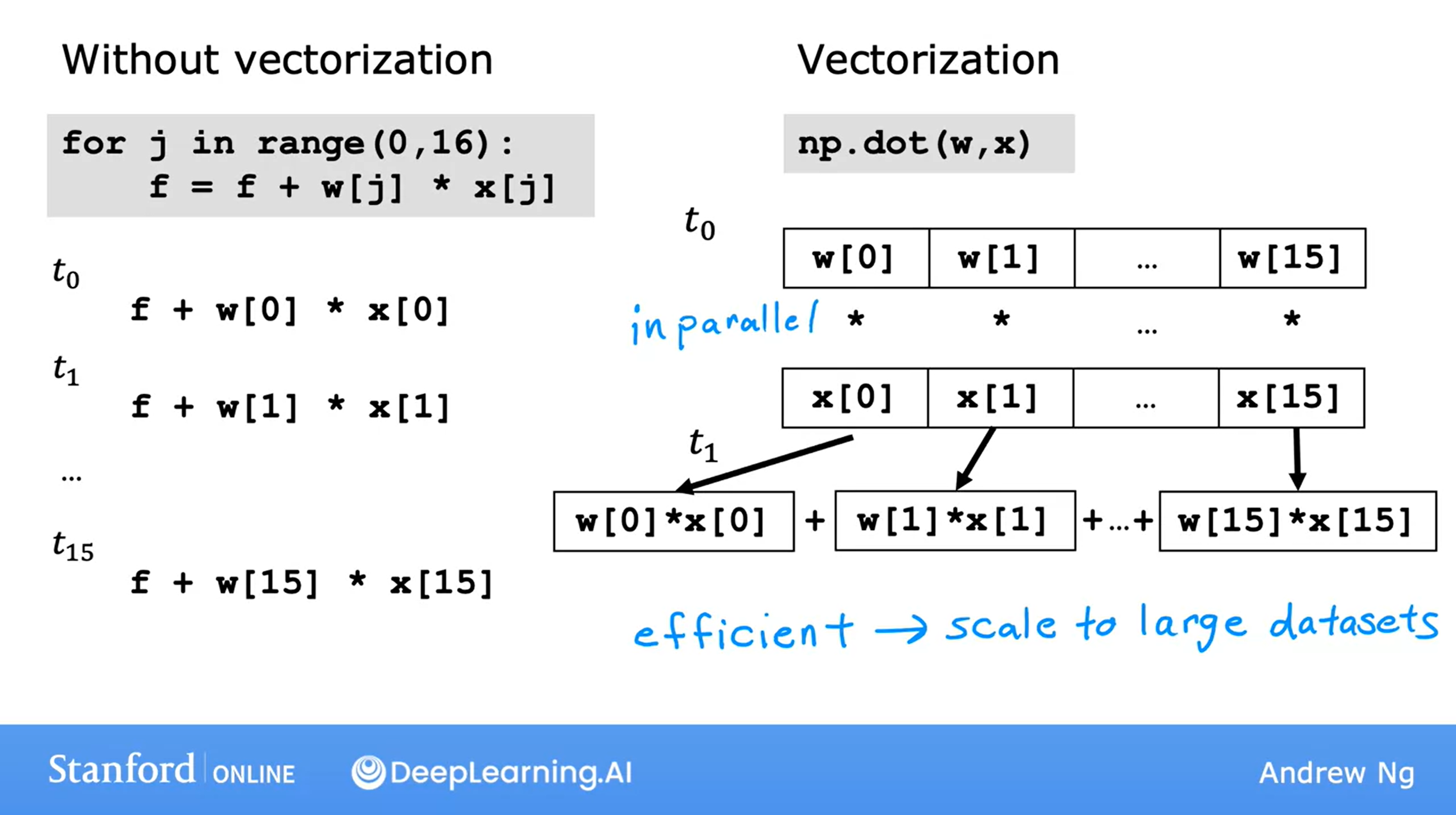 The reason that the vectorized implementation is much faster is behind the scenes. The NumPy dot function is able to use parallel hardware in your computer and this is true whether you’re running this on a normal computer, that is on a normal computer CPU or if you are using a GPU, a graphics processor unit, that’s often used to accelerate machine learning jobs. The ability of the NumPy dot function to use parallel hardware makes it much more efficient than the for loop or the sequential calculation that we saw previously.