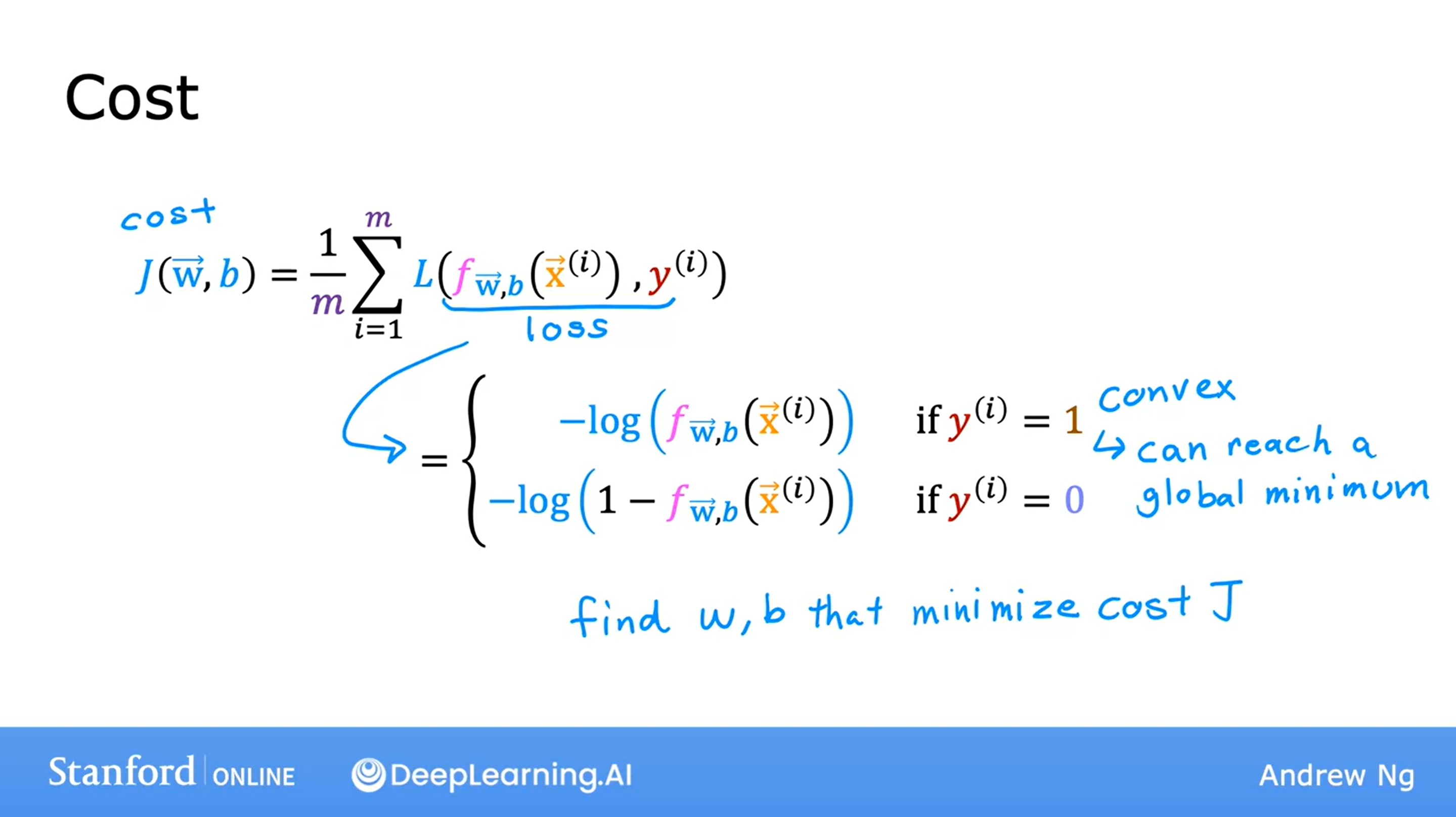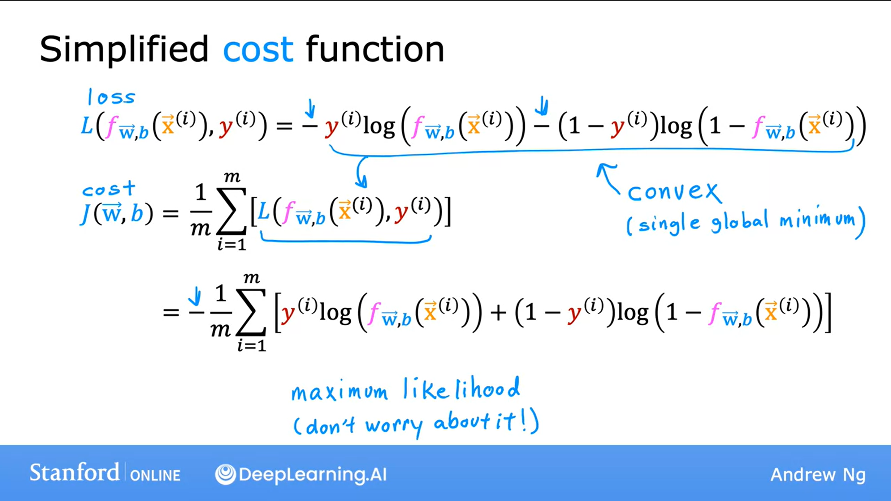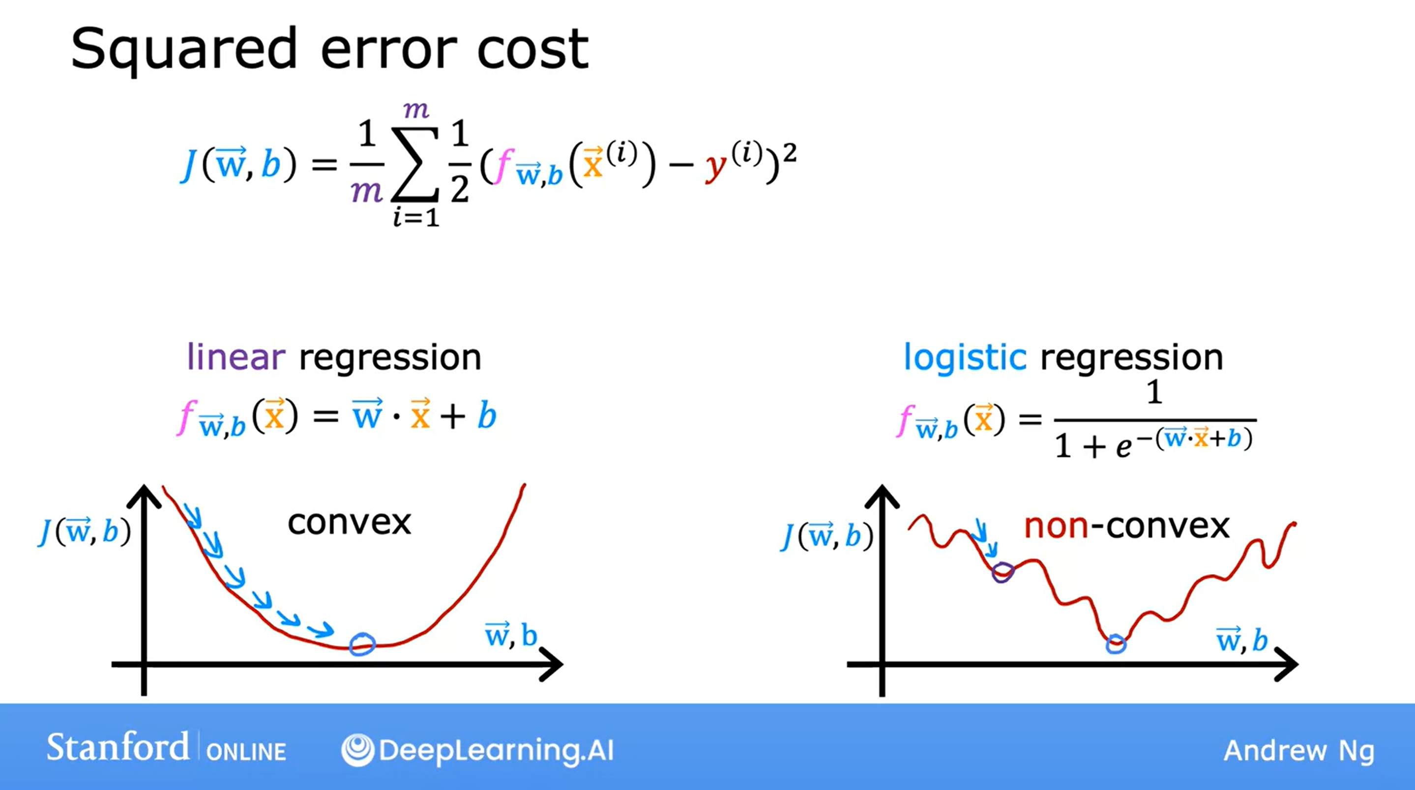 前面学习的Squared error cost function 在逻辑回归里面并不适用,会出现很多的局部极小值local minima,同时函数J并非一个convex,如下图所示